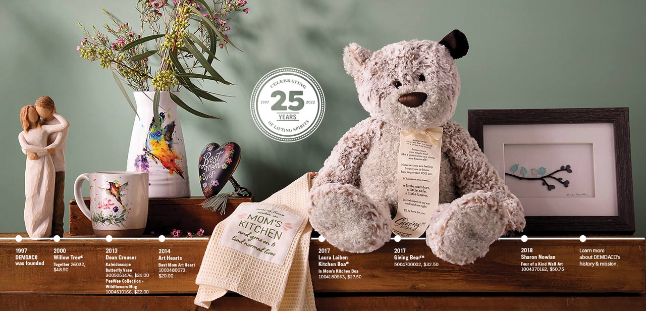Pronounced dem-day-koh, and named for our founders Demi and Dave, for over 25 years, we’ve designed and curated purposeful gifts that help Lift the Spirit - in times of celebration, when comfort is needed or just to put a smile on someone's face. These handcrafted artisan gifts are created to nurture goodness, support family and friends, and encourage us to inspire others… and ourselves. It started in 1991 when Demi and Dave created DD Traders while in Hong Kong. After a few years, they moved back to the United States while still managing DD Traders. Born out of a love and interest for the gifting industry, in May of 1997, DEMDACO was founded. Demi and Dave contacted three artists and asked if they’d want to help start a gift company—and the rest is history! After a few years, Willow Tree® launched and nothing has ever been the same. It has been the #1 gift line in the industry since 2000. Within the last few years, we’ve expanded to be consumer facing, not just wholesale! We’ve received awards, designed thousands of heirloom-quality, artisan products and tried to give back to the community in all we do. It’s been a wonderful 25+ years, and we can’t wait to keep growing and lifting spirits together!